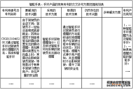 现有专利的专利规避方案挖掘的方式是依据基于企业自有研发全动态和自有产品市场反馈全动态所确定的核心的技术特征进行专利检索,选取与所述技术特征最相近的现有专利若干篇;依次分析每一篇现有专利所对应的技术问题、技术改进、所达到的技术效果,并对应所述对应的技术问题、技术改进、所达到的技术效果列出多种专利规避方案,以下以智能手表、手环产品的现有专利的专利规避方案挖掘为例,如下表示例。