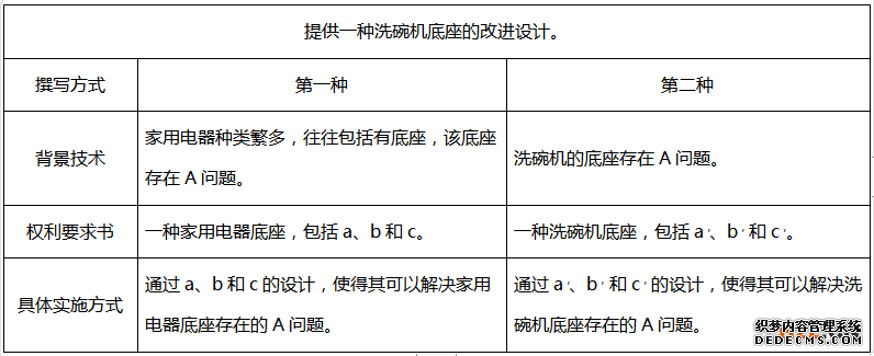 采用以上两种不同的背景技术、权利要求书和具体实施方式的撰写方式,分别可以呈现出:第一种撰写方式是针对家用电器的底座存在A问题而提出,涉及的具体的技术领域为家用电器领域;而第二种撰写方式明显是针对洗碗机的底座存在A问题而提出,涉及的具体的技术领域为洗碗机领域。该两种不同技术领域的选择会在后续的授权或确权程序中存在何种影响呢?