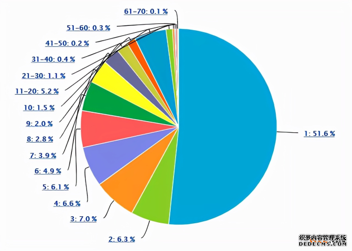 柔性电子器件相关专利的授权趋势如图1-2所示,与专利申请趋势成正相关性。其中2021、2020和2019这三年授权的专利数量最多,分别为79650件、68233件和55063件,占所分析专利的8.772%、7.515%和6.064%。由于专利授权公开也存在稍许延迟现象,因此本年度的专利申请数量通常不具有参考价值。