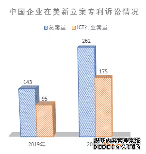 与此同时,由于中美贸易形势的新常态、全球民粹主义和保护主义的抬头和不断高涨,我国ICT企业的出海之路存在着一些挑战,遭遇着不断加剧的知识产权风险尤其是专利风险。以2020年中国企业涉美知识产权纠纷为例,新立案的专利诉讼案件共262起(中国企业仅作为原告的只有18起),其中ICT行业为175起,占比66.8%,较2019年的95起增长了84.2%(见图1);而在美国国际贸易委员会(ITC)发起的涉及中国企业的20起“337调查”案件中,ICT行业共11起,占比为55%,且均因专利侵权发起。