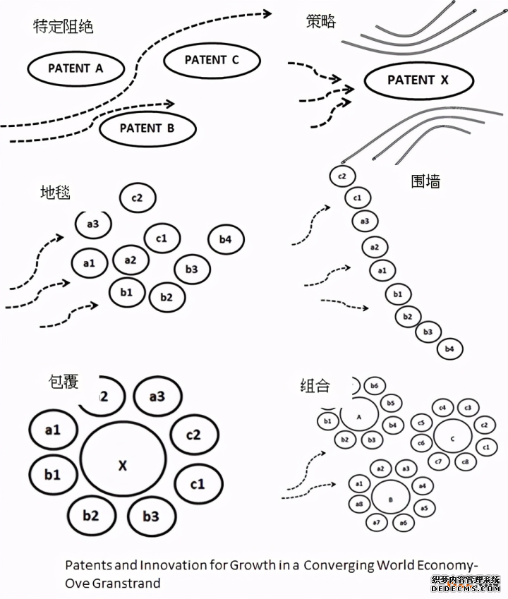在实务上,专利布局策略会根据企业面临到的实际状况而有不同的需求与对应做法,没有特定形式,为了更容易理解,介绍瑞典Chalmers大学工业管理学系Ove Granstrand教授所撰写的“The Economics and Management of Intellectual Property”一书中,列举6种常用专利布局模式: