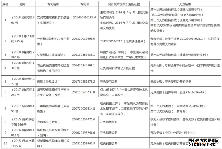 带着这样的疑惑,笔者在裁判文书网上进行了搜索,果真找到了几篇现有技术抗辩成立,却没有无效成功的案例,如下表所示: