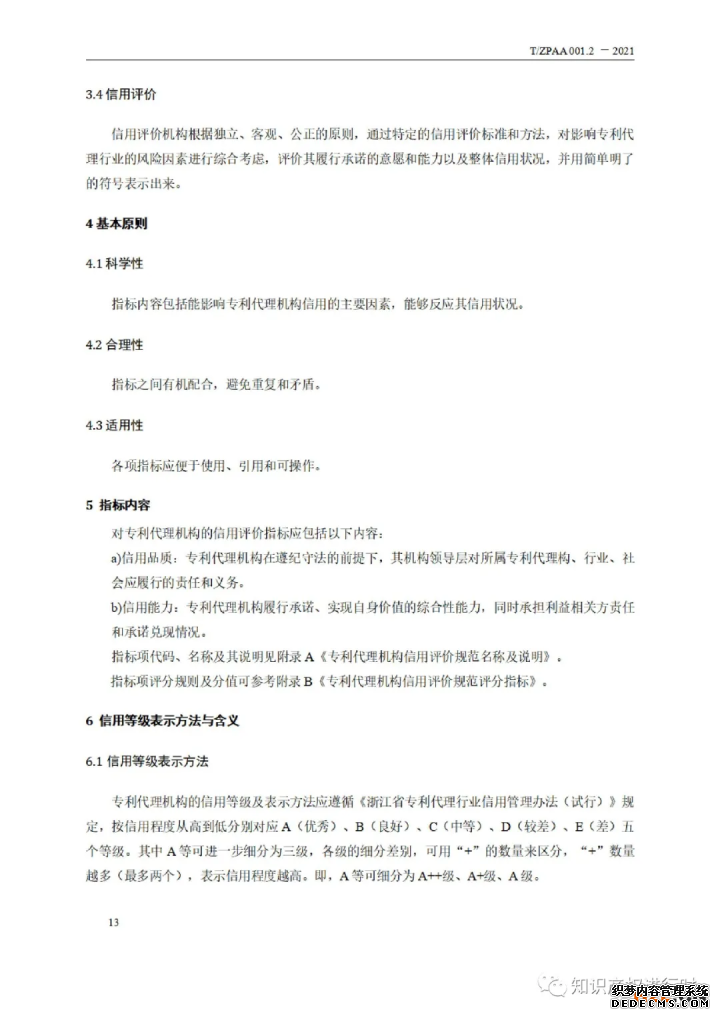 《专利代理信用评价规范》文件附《专利代理师信用评价规范评分指标》和《专利代理师信用评价规范信用等级》。浙江省专利代理师协会同时发布了A级以上专利代理师和专利代理机构。