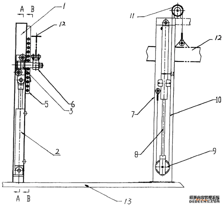 图中,1前立柱,2油缸,3滑块,4插销,5多孔板,6支座,7后立柱,8油缸,9动滑轮,10钢丝绳,11定滑轮,12上层踏板边梁,13车身。