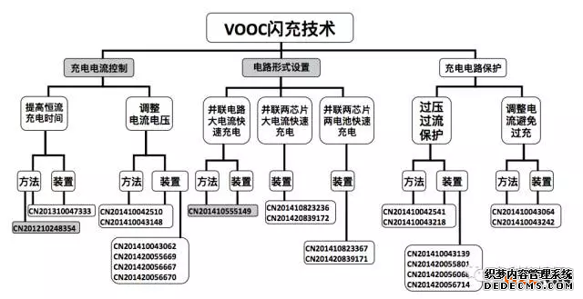 图2所示为OPPO在VOOC闪充技术方面截止2016年3月公开的专利分布情况,分别涉及闪充技术的充电电流控制、电路形式设置以及充电电路保护等技术分支。